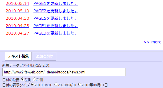 新着情報などお知らせフィード(RSS 2.0のみ)のURLを入力します。 ※サイト上の新着情報を挿入する場合は、初期値をそのままご利用下さい。 |