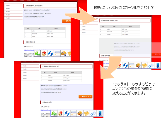 この状態でマウスの左ボタンを離すとコンテンツブロックを移動することができます。